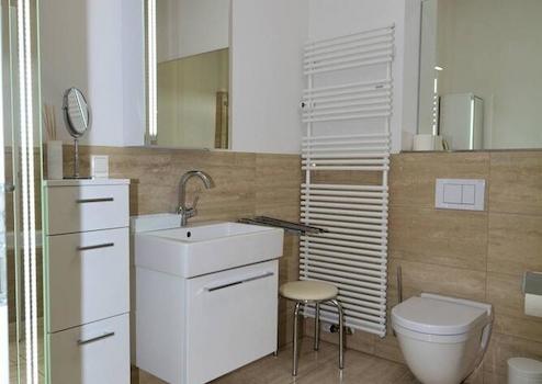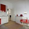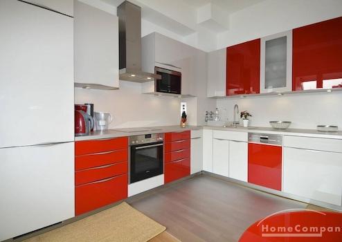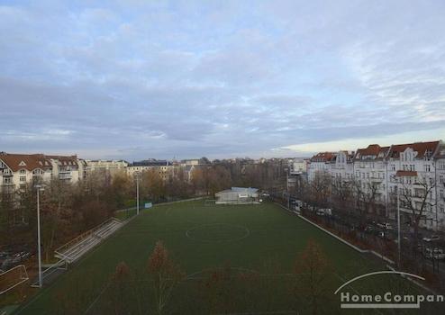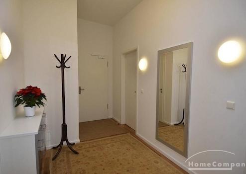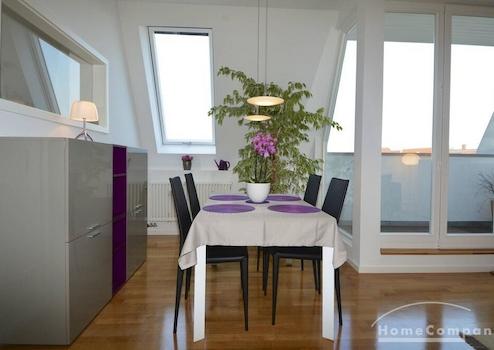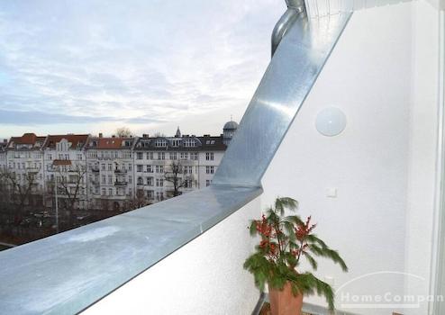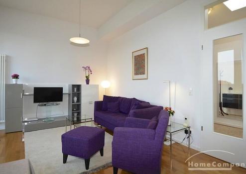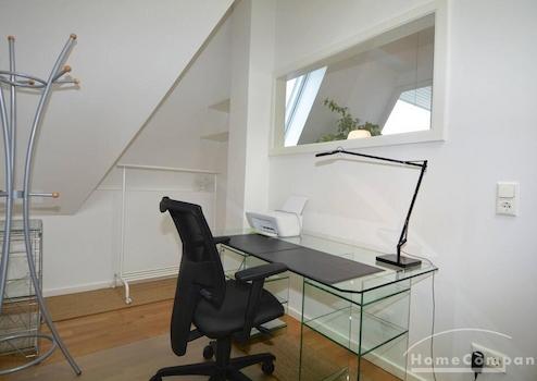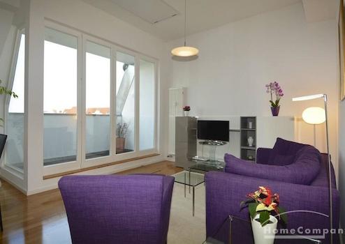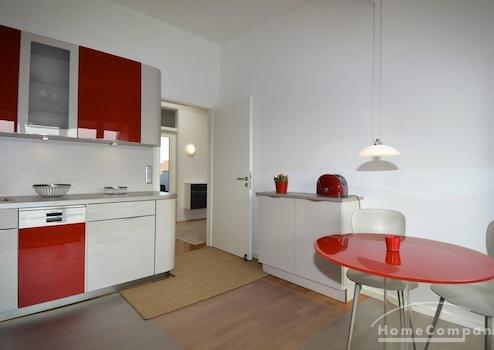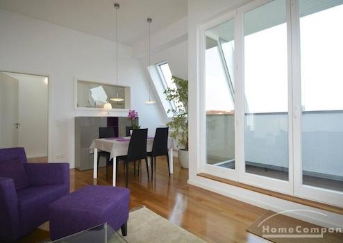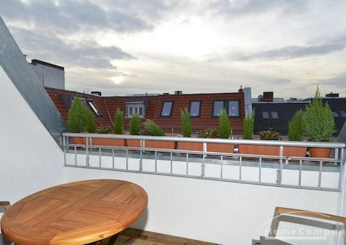 Diese fantastische, neue Drei-Zimmer-DG-Wohnung ist Teil eines grundsanierten Mehrfamilienhauses in Charlottenburger Bestlage. Das Wohnzimmer bietet hochwertige Sitzmöbel, einen neuen, großen Flachbild-TV, einen Esstisch und Zugang zu einem der beiden Dachbalkons. Von hier aus hat man einen weiten Blick nach Norden. Der Südbalkon (mit Markise) schließt an die Küche an, die vollständig und mit hochwertigen Geräten, WMF-Besteck und Villeroy & Boch-Geschirr ausgestattet ist. Das Schlafzimmer ist hell und gemütlich, es verfügt über ein Doppelbett und einen großen Kleiderschrank, und das Arbeitszimmer ist mit einem Schreibtisch aus Glas ausgestattet. Das außerordentlich große Bad hat Natursteinfliesen, ein Bidet, eine Badewanne und eine separate Dusche.