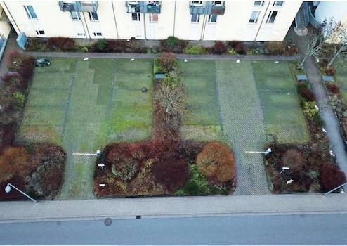 Die Fläche ist mit Rasengitter-Steinen gepflastert.