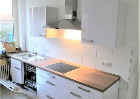 -moderne EBK in weiß mit vielen Extras wie Softclose, Backofen nach oben gebaut, großes Gefrierfach