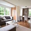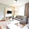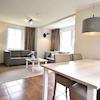 Geräumiges Wohnzimmer mit viel Licht. Schöne Fenster mit Fächern. Durch die Schiebetüren gelangen Sie auf die Terrasse. Schöne zeitgenössische Möbel, die alle zurückgelassen wurden.