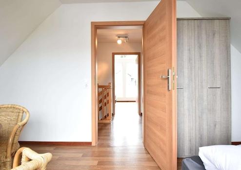 Das zweite Schlafzimmer liegt im Obergeschoss, befindet sich auf der linken Seite und hat einen eigenen Balkon. Hier ist 1 Boxspring und ein Kleiderschrank.