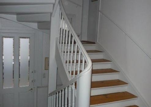 - Zum Dachgeschoss führt eine besonders breite, geschwungene Holztreppe, die in weiß ausgebildet ist