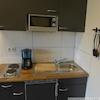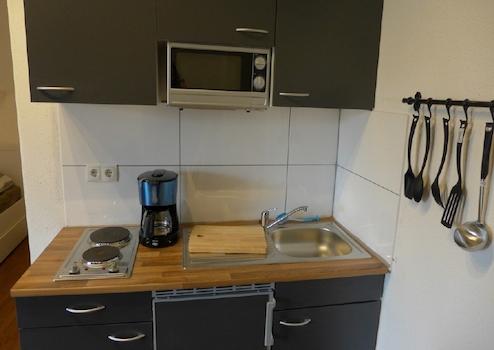 integrierte Kochnische mit kleiner Kühl-/Gefrierkombination, 2 elektrischen Kochfeldern, Spüle und Mikrowellengerät,