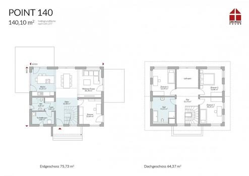 Das Point 140 - Zwei architektonische Highlights heben dieses Haus aus der Masse heraus. Das sind die moderne Hauseingangsüberdachung mit Flachdach auf der einen und die fast traufhohe Verglasung auf der anderen Seite. Mit dem hohen Luftraum über dem Essplatz und der Galerie im Obergeschoss bringt das Riesenfenster ein unglaublisches Raumerlebnis.Der luftige Grundriss im Erdgeschoss erfährt damit eine neue Dimension. Mit 3 Schlafzimmern im OG und einem zusätzlichen Raum auf der unteren Ebene ist auch für die Familienplanung ,, Luft nach oben".