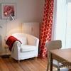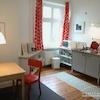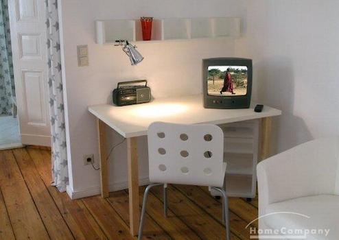 Ein-Zimmer-Wohnung in Berlin Kreuzberg, mit hochwertigem Mobiliar, gefliestem Wannenbad, Zentralheizung, Kabel TV, Sessel und Arbeitsplatz. Das Bett ist 140 cm breit.