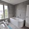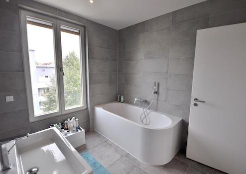 * Hochwertige Bad-Ausstattung von renommierten Marken-Herstellern mit Feinsteinzeug-Platten, bodengleicher Dusche & elektrischem Handtuchheizkörper