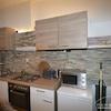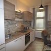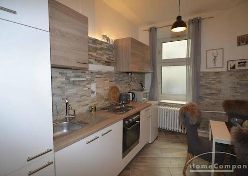 Die zentral und doch sehr ruhig im Gartenhaus gelegene Wohnung wurde größtenteils frisch renoviert und ist gemütlichen und zugleich modern. Man betritt die Wohnung durch einen kleinen Flur. Links befindet sich eine sehr gemütliche, durch die Steinoptik urig anmutende Wohnküche, in der man essen und gemütlich verweilen kann. Es gibt einen Esstisch, einen Kühlschrank, einen separaten Gefrierschrank, Herd, Backofen mit sämtlichen Funktionen, Mikrowelle und die wichtigsten elektronische Geräte.