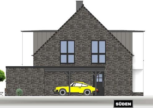 An der linken Hausseite wird ein Doppel-Carport mit einem angrenzenden Geräte- bzw. Hobbyraum erstellt. Vom Carport hat einen direkten Zugang ins Objekt bzw. in den Hauswirtschaftsraum.