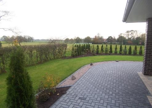 Die Grundstücksgrenzen sind mit einer lebenden Hecke eingefriedet. Das Gartengrundstück wird sehr pflegeleicht angelegt und verfügt über ein sehr gutes Gestaltungspotenzial. Die Gartenterrasse sowie die Hoffläche werden einheitlich bepflastert. Die geschützte und teil überdachte Terrasse verspricht Ihnen schon jetzt Erholung und Entspannung an sonnigen Tagen.