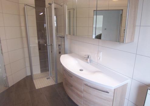 Das hochwertige und geschmackvolle Badezimmer wird wie folgt ausgestattet: Wannenanlage, großzügige Waschtischanlage mit integriertem Möbel, bodentiefe Dusche mit Glastür, Hänge WC, deckenhohe und sehr geschmackvolle Verfliesung. Hochwertige Elemente und Armaturen. Das Gäste WC ist gleichwertig ausgestattet, Hänge WC, Waschbecken mit Halbsäule, sowie einheitliche Verfliesung.