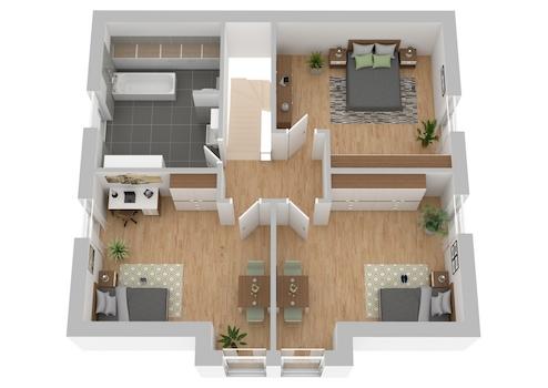 In diesem Haus genießen Sie einen Komfort, den Ihnen für gewöhnlich nur ein größeres Haus bieten kann. Viel Platz und genügend Stauraum für die Familie. Von der Haustür bis unter den Dachfirst ist dies ein Haus für die junge Familie. Die Gestaltung des Erdgeschosses bietet Ihnen die Möglichkeit eines gemeinschaftlichen Zusammenlebens. Platz für einen großen Esstisch und das Familiensofa sorgen dafür, dass Sie hier viele Aktivitäten mit der Familie gestalten können. Auch an Tagen die nicht zum rausgehen einladen. Die Küche ist groß genug um einen Frühstückstisch aufzustellen oder an Weihnachten als Backstube zu dienen. Kinder freuen sich über die 2 identischen Zimmer im Obergeschoss, denn so kann es keinen Streit geben. Auch das Schlafzimmer verfügt über genügend Stellfläche für ein Bett und Schränke. Und das Beste: Sie können daran auch etwas ändern. Gerne Planen wir mit Ihnen alle Ihre Vorstellungen und Wünsche in ein individuelles Bauvorhaben ein. Ob Ihr Haus größer oder kleiner werden soll, eine Dusche im Gäste-WC braucht, wir helfen Ihnen dabei Ihren Traum vom perfekten Eigenheim zu realisieren. Damit Ihr Haus genau so individuell wird wie Sie, der Bauherr! Ein weiterer Vorteil des Hauses ist sein Preis/Leistungsverhältnis, welches gerade jungen Familien genügend Spielraum bietet in Kombination mit der modernen Bauart die schon ab dem Einzug beim Sparen von Energie hilft. Zum Beispiel produziert die Solaranlage im Sommer Ihr warmes Wasser und die moderne Gas-Brennwerttherme von Vailant heizt im Winter extrem effektiv. So sind Sie gut für die Zukunft gerüstet und sparen dort, wo man nicht am falschen Ende spart.