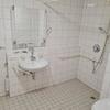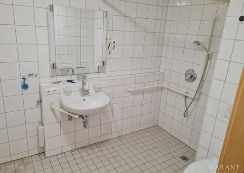 Natürlich ist hier ein rollstuhlgerechtes Bad mit einem Waschmaschinenanschluss vorhanden.