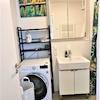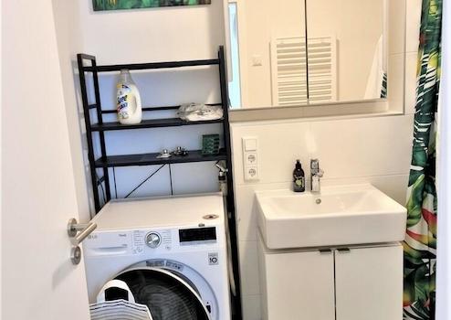 + Im geräumigen Bad mit Dusche steht ein moderner Waschtrockner zur Verfügung.