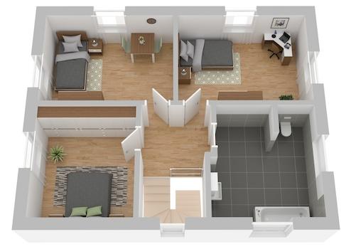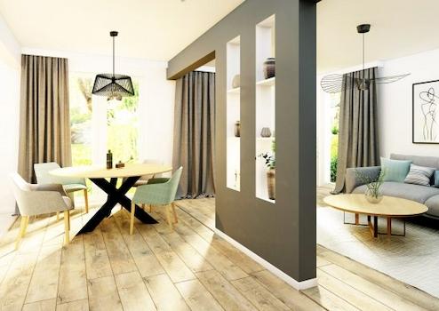 In diesem mediterran gestalteten Haus genießen Sie einen Komfort, den Ihnen für gewöhnlich nur ein größeres Haus bieten kann. Viel Platz und genügend Stauraum für die Familie. Von der Haustür bis unter den Dachfirst ist dies ein Haus für die junge Familie. Die Gestaltung des Erdgeschosses bietet Ihnen die Möglichkeit eines gemeinschaftlichen Zusammenlebens. Platz für einen großen Esstisch und das Familiensofa sorgen dafür, dass Sie hier viele Aktivitäten mit der Familie gestalten können. Auch an Tagen die nicht zum rausgehen einladen. Die Küche ist groß genug um einen Frühstückstisch aufzustellen oder an Weihnachten als Backstube zu dienen. Kinder freuen sich über die 2 identischen Zimmer im Obergeschoss, denn so kann es keinen Streit geben. Auch das Schlafzimmer verfügt über genügend Stellfläche für ein Bett und Schränke. Und das Beste: Sie können daran auch etwas ändern. Gerne Planen wir mit Ihnen alle Ihre Vorstellungen und Wünsche in ein individuelles Bauvorhaben ein. Ob Ihr Haus größer oder kleiner werden soll, eine Dusche im Gäste-WC braucht, wir helfen Ihnen dabei Ihren Traum vom perfekten Eigenheim zu realisieren. Damit Ihr Haus genau so individuell wird wie Sie, der Bauherr! Ein weiterer Vorteil des Hauses ist sein Preis/Leistungsverhältnis, welches gerade jungen Familien genügend Spielraum bietet in Kombination mit der modernen Bauart die schon ab dem Einzug beim Sparen von Energie hilft. Außerdem verfügen unsere Häuser über Vaillant Technik der neuesten Generation . !!!