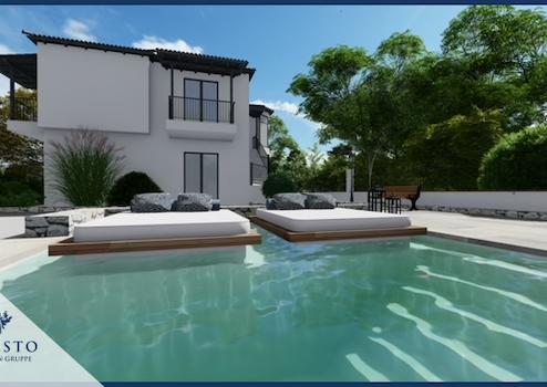 Über die Wohnungseigene Treppe erreichen Sie den sehr gepflegten Garten sowie den beheizbaren Pool mit Sonnenterrasse und Sonnenliegen.