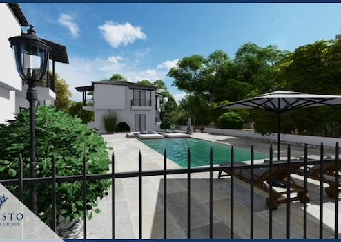 Über die wohnungseigene Treppe erreichen Sie den sehr gepflegten Garten sowie den beheizbaren Pool mit Sonnenterrasse und Sonnenliegen.