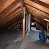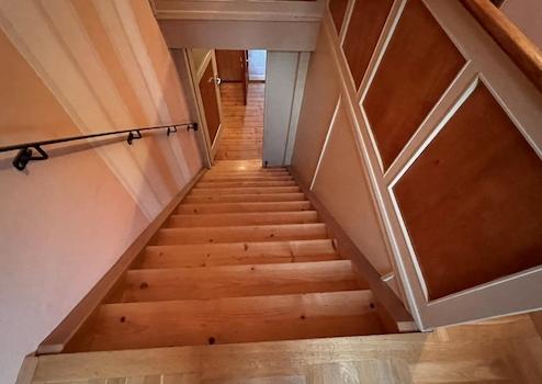 Treppen: Massive Treppe mit Holzhandlauf sowie Holztreppe ins Dachgeschoss