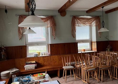 Restaurant (ca. 35 m² mit ca. 35 Plätzen), Saal (ca. 110 m²), 2 Doppelzimmer mit ca. 25 m² sowie eine 3-Zimmer-Wohnung im DG mit ca. 125 m² und eine 2-Zimmer-Wohnung im EG mit ca. 65 m².