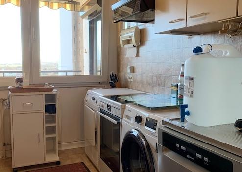 Das Dusche / WC ist hell gefliest, der Boden wurde mit Garnitboden ausgestattet. Die Küche ist ebenfalls gefliest.