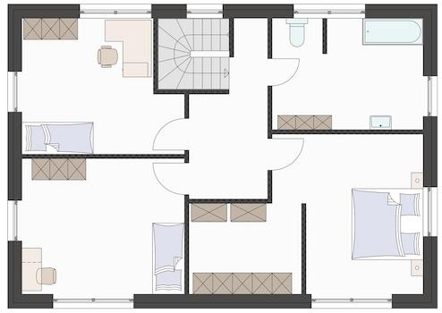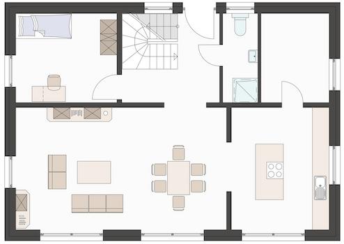 In diesem Haus genießen Sie einen Komfort, den Ihnen für gewöhnlich nur ein größeres Haus bieten kann. Viel Platz und genügend Stauraum für die Familie. Von der Haustür bis unter den Dachfirst ist dies ein Haus für die junge Familie. Die Gestaltung des Erdgeschosses bietet Ihnen die Möglichkeit eines gemeinschaftlichen Zusammenlebens. Platz für einen großen Esstisch und das Familiensofa sorgen dafür, dass Sie hier viele Aktivitäten mit der Familie gestalten können. Auch an Tagen die nicht zum rausgehen einladen. Die Küche ist groß genug um einen Frühstückstisch aufzustellen oder an Weihnachten als Backstube zu dienen. Kinder freuen sich über die 3 identischen Zimmer im Obergeschoss, denn so kann es keinen Streit geben. Auch das Schlafzimmer verfügt über genügend Stellfläche für ein Bett und Schränke. Und das Beste: Sie können daran auch etwas ändern. Gerne Planen wir mit Ihnen alle Ihre Vorstellungen und Wünsche in ein individuelles Bauvorhaben ein. Ob Ihr Haus größer oder kleiner werden soll, eine Dusche im Gäste-WC braucht, wir helfen Ihnen dabei Ihren Traum vom perfekten Eigenheim zu realisieren. Damit Ihr Haus genau so individuell wird wie Sie, der Bauherr! Ein weiterer Vorteil des Hauses ist sein Preis/Leistungsverhältnis, welches gerade jungen Familien genügend Spielraum bietet in Kombination mit der modernen Bauart die schon ab dem Einzug beim Sparen von Energie hilft.Dieses wird in diesem FIBAV Markenhaus durch denn Einsatz einer Vaillant LWWP der neusten Generation - sehr leiser Betrieb - inklusive Fußbodenheizung unterstützt.!! So sind Sie gut für die Zukunft gerüstet und sparen dort, wo man nicht am falschen Ende spart. Den Grundriss zu Ihrem neuen Traumhaus planen Sie innerhalb der Familie und wir erwecken diesen in der Bauphase für Sie zum Leben.