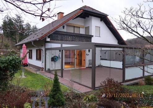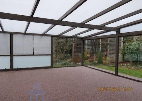 Darüber wurde ein ca. 45 m² großer Wintergarten in Aluminiumkonstruktion errichtet, der als großzügige Erweiterung des Wohn-Essbereiches genutzt werden kann.