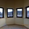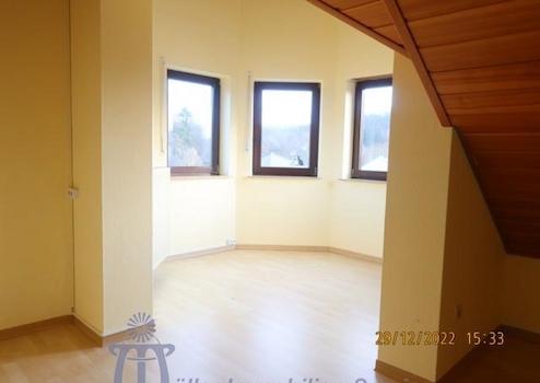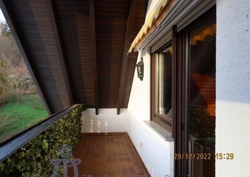 Diele, Küche, großer Studioraum (Wohn-Essbereich), überdachter Balkon mit herrlichem Fernblick, Schlafzimmer, Turmzimmer (oder Kinderzimmer), Bad (Dusche, Waschbecken, WC)