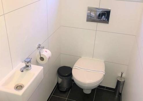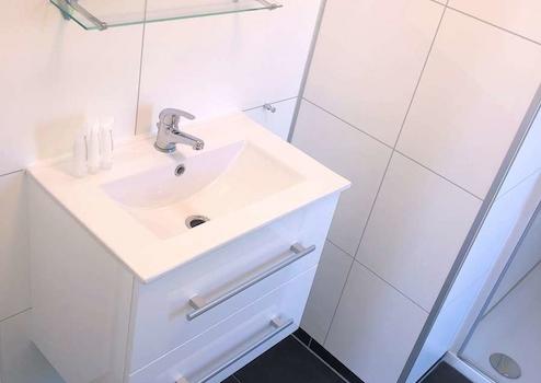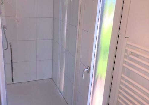 Das moderne und geräumige Badezimmer verfügt über ein waschbecken mit Möbeln, eine begehbare Dusche, einen Designheizkörper, einen großen Dreh-Kipp-Fensterrahmen, eine mechanische Belüftung und alle Wände sind mit 100% wasserdichten Trespa-Platten in Fliesenoptik ausgestattet. Es gibt eine separate Toilette mit Toilettenbrunnen und einem Dreh-/Kipprahmen. Wieder die 100 % wasserdichten Trespa-Platten in Fliesenoptik.