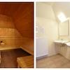 Das Badezimmer 2 befindet sich im Obergeschoss und verfügt über eine Dusche, 2 Waschbecken und eine traditionelle Sauna.