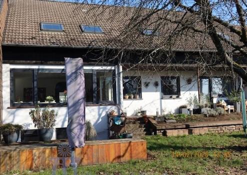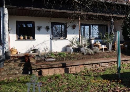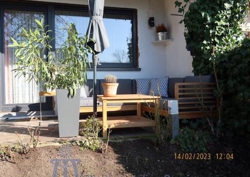 Vom lichtdurchfluteten Wohn-Esszimmer mit großer durchgängiger Fensterfront gelangt man auf eine ca. 20 m² große überdachte SW-Terrasse, auf eine ca. 20 m² große in Bangkirai-Holz angelegte Freiterrasse sowie in den komplett eingefriedeten pflegeleichten Garten, der als Rasenfläche mit Ziersträuchern und einem alten ertragreichen Kirschbaum angelegt ist.