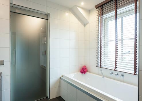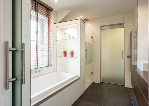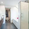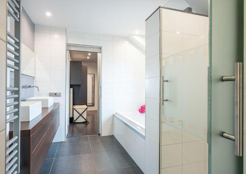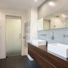 Luxuriöses Badezimmer (2,93 x 2,56 m) mit Badewanne, Dusche, Badmöbel mit Doppelwaschbecken und Glasschiebetüren.