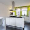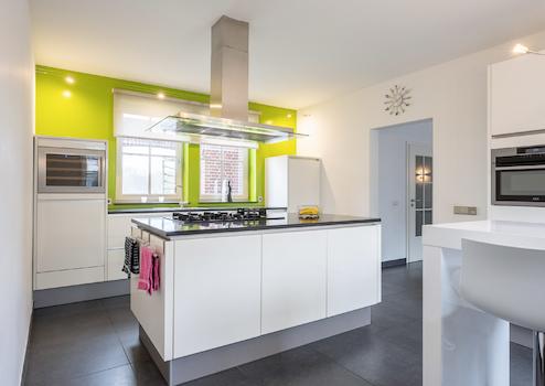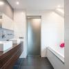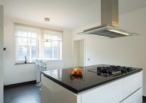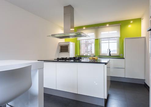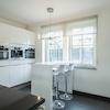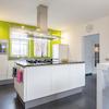 Küche (5,17 x 3,71 m) mit moderne Einbauaufstellung mit Kochinsel, Gasherd, Geschirrspüler, Kaffeevollautomat, Kombi-Backofen/Mikrowelle, Dampfgarer, Kühlschrank, Weinkühlschrank und Granitarbeitsplatten.