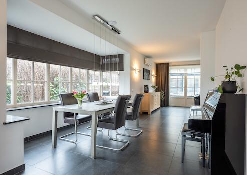 Geräumiges Wohnzimmer (11,17 x 6,90/6,16 m) mit Erker, zwei doppelten Terassentüren zum Garten und zeitlosem anthrazitfarbenem Fliesenboden.