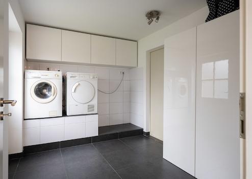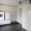 Hauswirtschaftsraum mit Anschlüssen für Waschmaschine, Trockner (3,46 x 2,45 m) mit Zugang zur Garage und zum Garten.