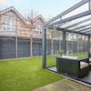 Nahezu unterhaltsfreier angelegter Garten mit Terrassen mit Zierpflaster, Kunstrasen und Spalierbäumen.
