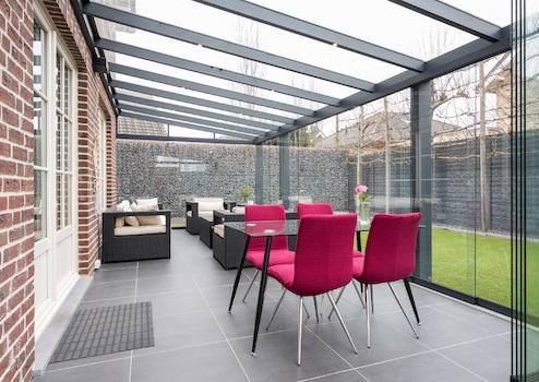 Großer Wintergarten (6,72 x 3,23 m) in Aluminiumbauweise mit Glasschiebewänden,Fliesenboden und Klimaanlage.