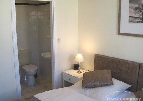 Die ca. 30 m² große 2-Zimmerwohnung hat zwei Fenster nach Westen und 1 Fenster mit Blick auf die Geibelstraße. Im Schlafzimmer stehen zwei bequemen Boxspringbetten mit verstellbaren Kopfteil (je 90 x 200 cm). Die Küche verfügt über Spüle, Kombinierten Backofen mit Mikrowelle, Cerankochfeld und einen Kühlschrank mit Drei-Sterne Gefrierfach.