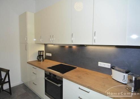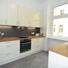 Charmante frisch renovierte 2-Zimmer-Altbauwohnung, mit Stuckdecken, Dielenboden, hochwertige Einbauküche mit Markengeräten Hochglanz Oberflächen, Ceranfeld, Dunstabzug, Kühlschrank mit Gefrierfach, kleiner Esstisch in der Küche, Waschmaschine. Tageslichtbad mit Wanne. Moderner Einrichtungsstil, Wohnzimmer mit moderner Couch und Schreib-/Esstisch ausgestattet. Schlafzimmer mit großem Polsterdoppelbett eingerichtet.