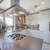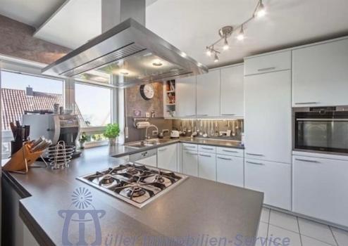 Die zum Esszimmer halb offene Küche ist mit einer hochwertigen Poogenpohl-Einbauküche mit eisblauen Fronten und neuwertigen Elektrogeräten ausgestattet, auch eine Speisekammer steht zur Verfügung.