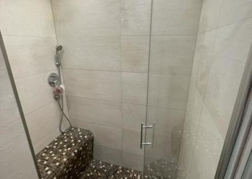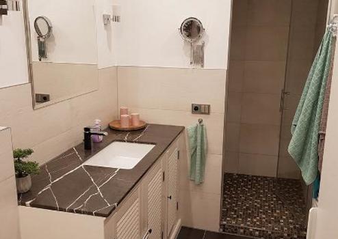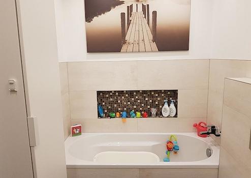 Dieses überzeugt nicht nur mit seinem abgetrennten Duschbereich und der zusätzlichen Badewanne, sondern auch mit dem edlen Marmor-Waschtisch sowie den hochwertigen Wascharmaturen. Die zusätzliche Fußbodenheizung im Badezimmer sorgt für behagliche Wärme.