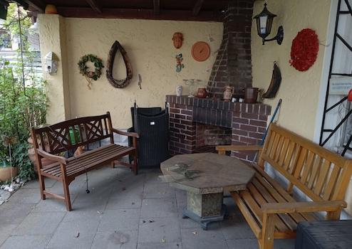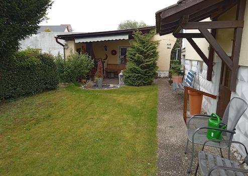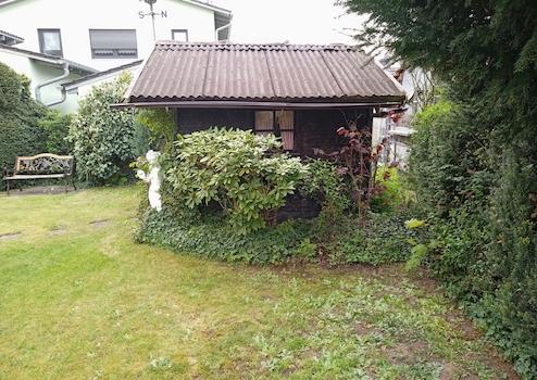 Im schön angelegten Garten befindet sich ein gemütlicher überdachter Freisitz sowie eine kleine Holzhütte für den Rasenmäher, und Gartengeräte..