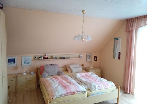 Im Dachgeschoss mit ausreichend hohem Kniestock bieten drei helle Zimmer mit Balkon bzw. französischem Balkon und Blick in den Garten ausreichend Platz für eine kleine Familie.