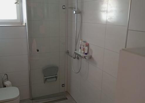 Hier befindet sich auch ein modernes (2 Jahre altes) Badezimmer mit einer begehbaren Dusche, Waschbecken und WC.