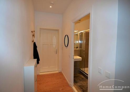 Schöne 1 Zimmer Wohnung in Berlin Mitte. Das Apartment ist mit einem Doppelbett , Fernseher, einer Stehlampe, Schreibtisch und einem großen Fenster ausgestattet. Das Badezimmer verfügt über eine Dusch und ein WC.