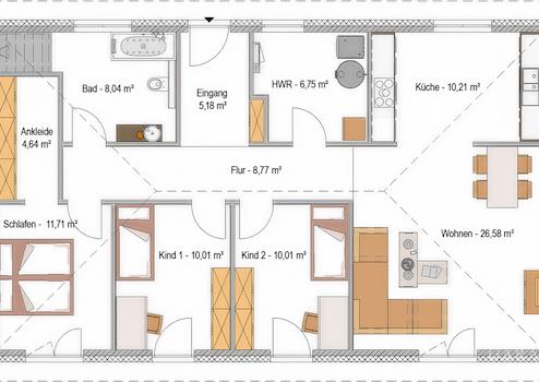 Der Grundriss kann kostenfrei und individuell nach Ihren Wünschen geplant werden, sämtliche TRAGENDE !!! und NICHTTRAGENDE !!! Innenwände können ohne Aufpreis abgeändert werden.
