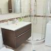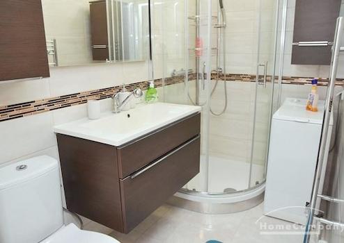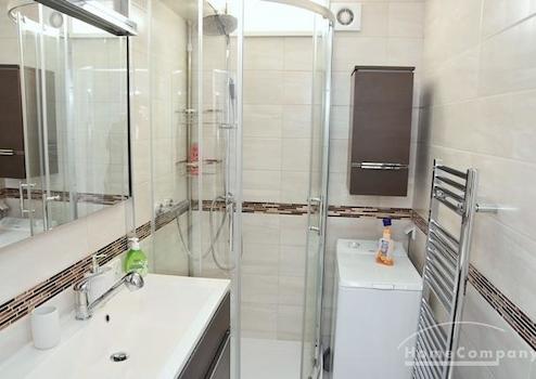 Modernes und helles Duschbad/WC mit Waschmaschine.