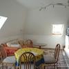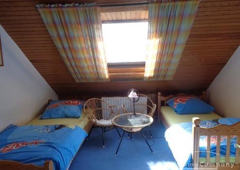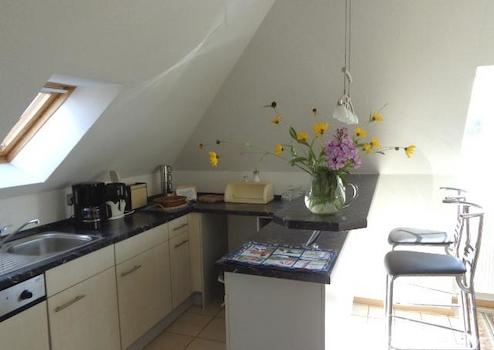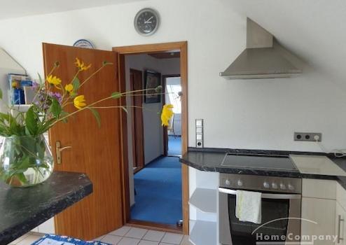 Die helle 2,5-Zimmer-Wohnung liegt im Dachgeschoss eines Einfamilienhauses und hat einen separaten Eingang. es gibt insgesamt Insgesamt vier Schlafplätze auf etwa 65 Quadratmetern. Zur Wohnung gehören ein geräumiges Wohnzimmer mit antikem Esstisch, eine offene Einbauküche mit Bartresen und Geschirrspüler, zwei Schlafzimmer und ein Tageslichtbad mit Badewanne und Dusche. Das eine Schlafzimmer bietet ein Doppelbett und einen Kleiderschrank mit Spiegel, das andere Schlafzimmer zwei Einzelbetten, zwei Kleiderschränke mit Spiegel, ein Sessel und ein Couchtisch. Die Wohnung hat Teppichboden. Ein Fernseher ist vorhanden. Schönes, helles Ambiente mit Blick auf den Garten und zur Förde. Ein Platz im Garten/die Gartennutzung ist inklusive.