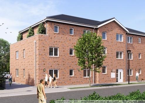In sehr zentraler Ortskernlage und in Nachbarschaft zum Marktplatz / Heimathaus sowie zum Einkaufszentrum entsteht dieses reiflich durchdachte und attraktive Neubauvorhaben, das hohen und modernen Wohnansprüchen in jeder Hinsicht gerecht wird. Die insgesamt 9 Eigentumswohnungen mit ansprechender Architektur, individuellen Grundriss- und Raumplanungen sowie Wohnungsgrößen zwischen ca. 55 m² bis 100 m² Wohnfläche bieten verschiedenen Zielgruppen ein neues Zuhause. Großzügige Terrassen/Balkone/Dachterrassen, interessante Fenstergestaltungen und lichtdurchflutete Wohnräume geben diesem Haus den besonderen Charme. Hell und großzügig präsentieren sich diese anspruchsvollen Eigentumswohnungen und entfalten insbesondere über die gelungene Raumaufteilung hinaus ein hohes Maß an Wohnqualität. Die Wohnfläche dieser Eigentumswohnung teilt sich wie folgt in Wohnen/Essen/Kochen, zwei Schlafzimmer, Badezimmer, Flur und Abstellraum auf. Diese Staffelgeschoss - Penthouse-Wohnung - verfügt über eine großzügige Dachterrasse. In absoluter Zentrumslage zum Marktplatz von Sögel entsteht diese Immobilie. Sie bietet für verschiedenste Zielgruppen ein rundum sorgloses Zuhause zum Wohlfühlen. Ideal geeignet als Kapitalanlage zur Vermietung, als eigengenutzte Immobilie oder als wunderbare Alternative zu Ihrem zu groß gewordenen Haus. Das ausgereifte Gesamtkonzept passt zu vielen Lebenssituationen und überzeugt mit reiflich durchdachten und rundum stimmigen Rahmenbedingungen. Zugleich bieten die örtlichen Gegebenheiten in Sögel unter anderem bezüglich Nahversorgung, Infrastruktur und Verkehrsanbindung einiges; für Berufspendler und Senioren optimal geeignet, um den Alltag praktisch und vielseitig zu gestalten. Die durchdachten und funktionalen Grundrisse summieren sich mit einer gehobenen Ausstattung und einer ansprechenden Optik zu einem harmonischen Gesamtkonzept.