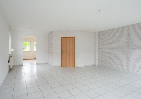 Wohnzimmer (7,53 x 5,41/5,06 m) mit Fliesenboden und 2 Doppelgartentüren.