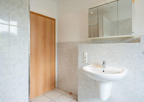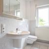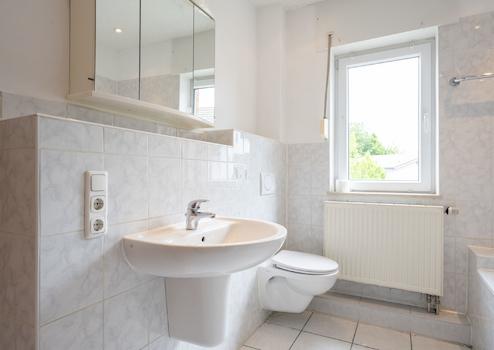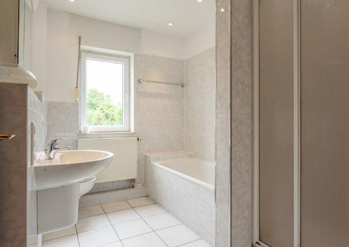Badezimmer (2,96 x 2,27 m) mit Badewanne, Dusche, Toilette und Waschtisch.