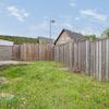 Umzäunter Hintergarten mit Terrasse und Rasenfläche.